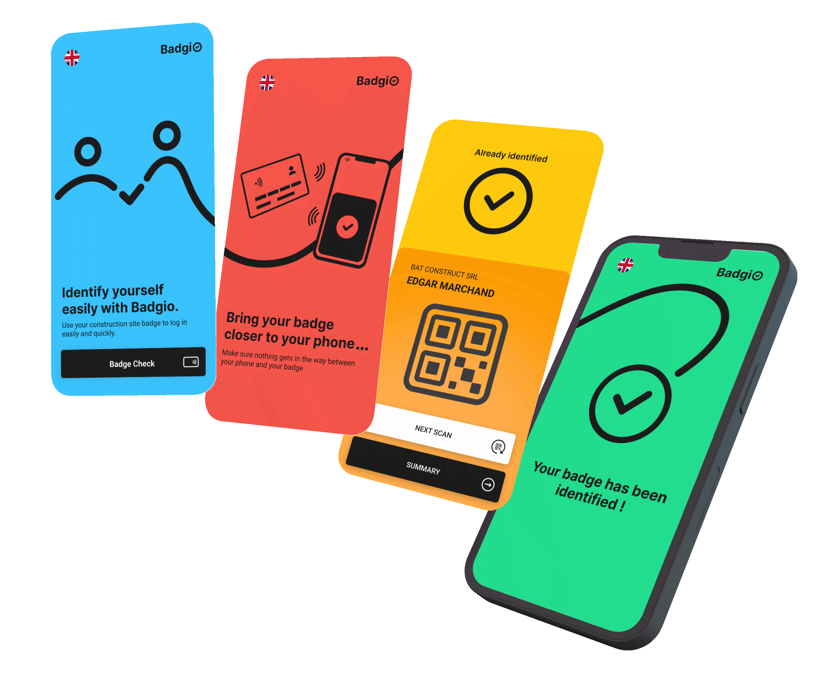BadgiO numérise les informations de votre badge NFC de chantier (construBadge, Lisabadge, etc) ou carte d'identité pour créer un QR code unique, personnel et sécurisé d'accès sur chantier.